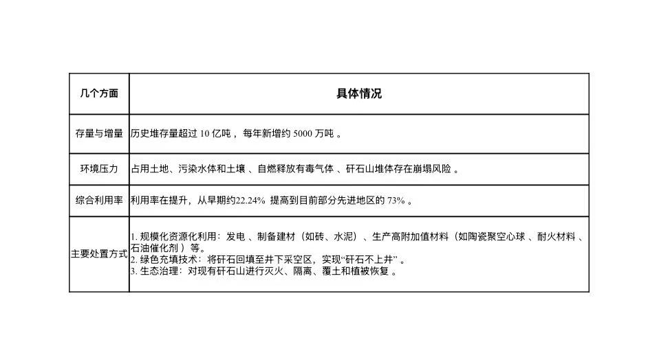 下表可以让我们看到当前山西省煤矸石的基本情况及处理处置的现状。