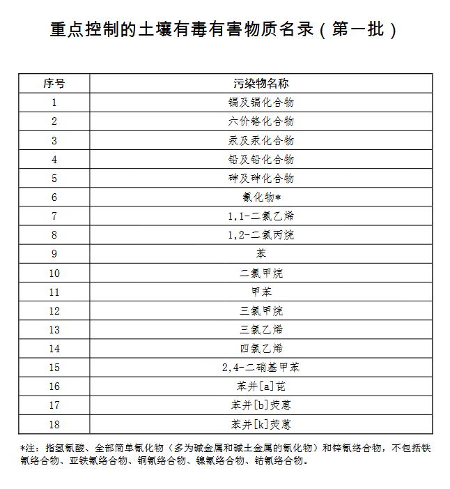重点控制的土壤有毒有害物质名录(第一批)